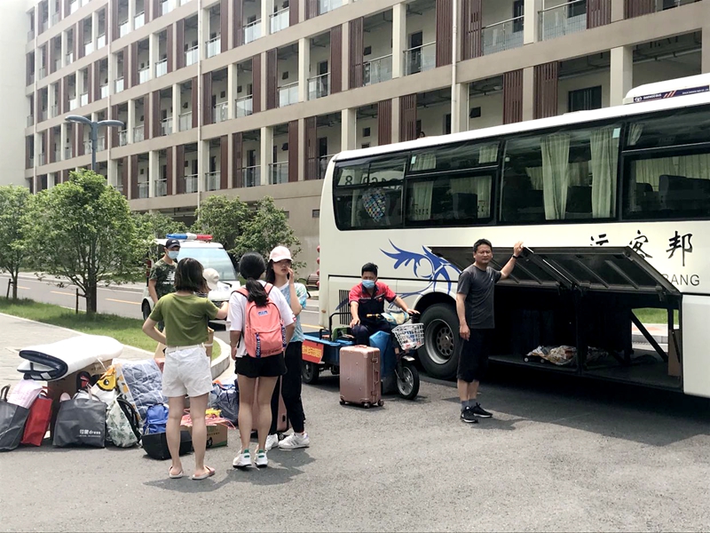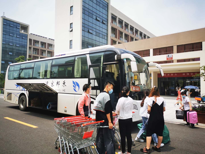 在疫情防控与二期施工同时进行的阶段,校区管委会努力让工作部署和防控措施落细落实,安保科提前制定了全方位的防控措施,开通绿色通道,所有大巴、出租车均可开到每位同学相对应的公寓楼门前,进楼后主动出示“跨校区转专业情况证明”,配合做好测体温、登记工作。自行乘坐出租车、公交车的学生由东门保安负责审核,校区安保科工作人员一早便来到校门口检查审核流程,助力学生搬运行李。
