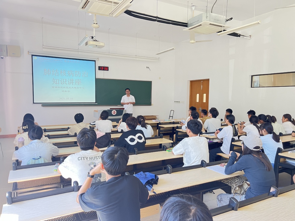 为切实做好西太湖校区新生结核病筛查与防控工作,10月10日,西太湖校区管理委员会特邀西湖街道社区卫生服务中心许航宇医生,对2025级部分新生开展肺结核防治知识宣传教育。