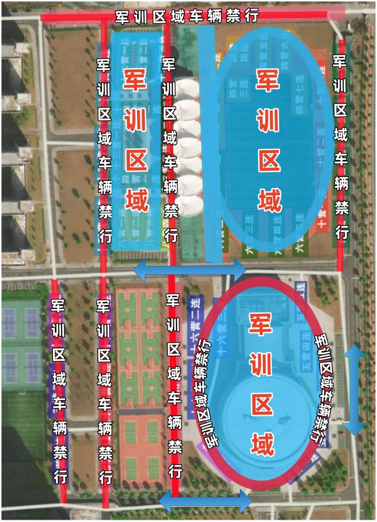 因2025级学生军训需要,自2025年10月27日-11月9日,西太湖校区将对以下道路、区域(具体见军训场地示意图)进行临时交通管制,车辆途经上述道路、区域请减速慢行,注意安全,配合保安人员指引。